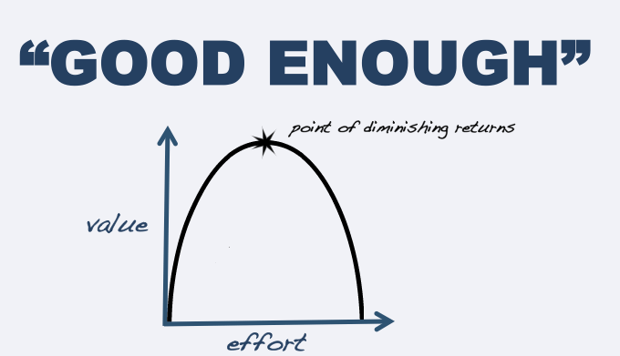 Highly applicable in most of our parallel day-to-day tasks, many times, we have to conclude, Good Enough and ship the product. If we don’t we start to overthink & overedit to where it becomes counter productive. We have to recognize when the law of diminishing returns has arrived. There even have been times when I never did ship, as my counter-intuition talked me out of something and convinced me how bad the idea was. (Maybe it really wasn’t?)